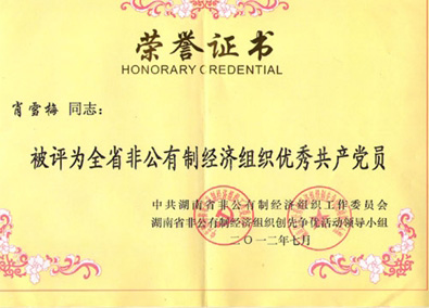 2025年12月5日,在(zai)湖南省非公有制(zhì)企業黨的建設工(gōng)作暨創先争優活(huo)動表彰會上,董事(shi)會秘書、工會主席(xi)、董事會辦公室主(zhu)任肖雪梅👉同志榮(róng)獲“湖南省非工有(you)制經濟組織優秀(xiu)共産黨員”的關榮(rong)稱号。
