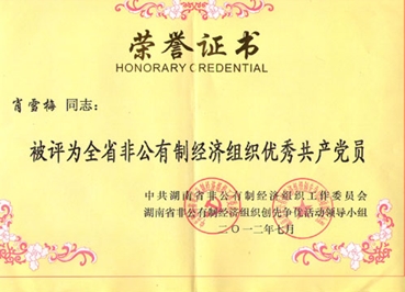 肖(xiāo)雪梅榮(rong)膺“湖南(nan)省非公(gōng)企業優(you)秀共産(chan)黨員”